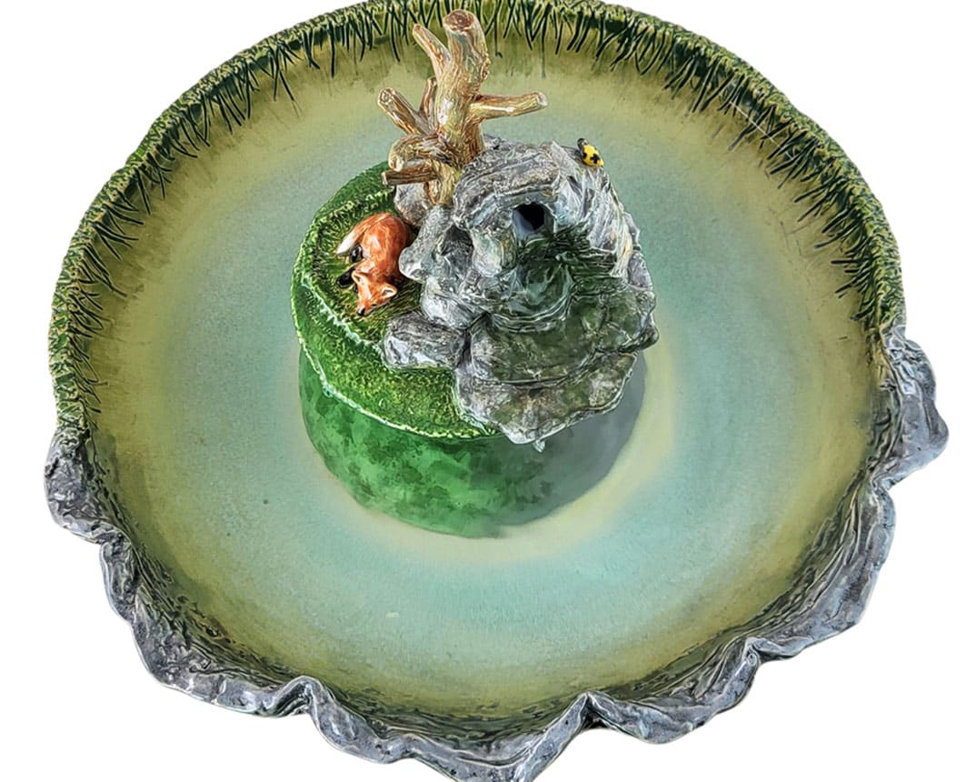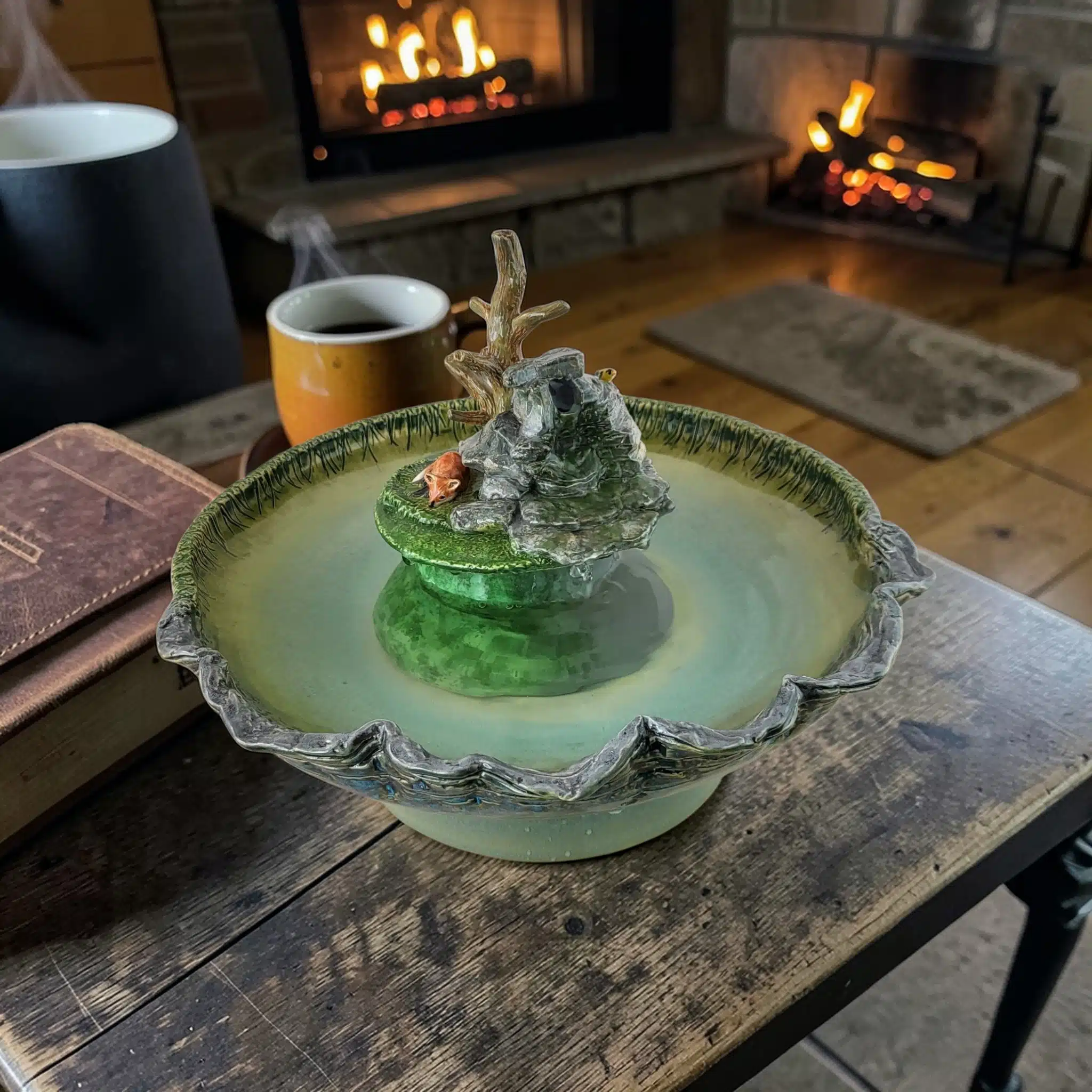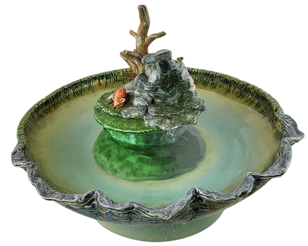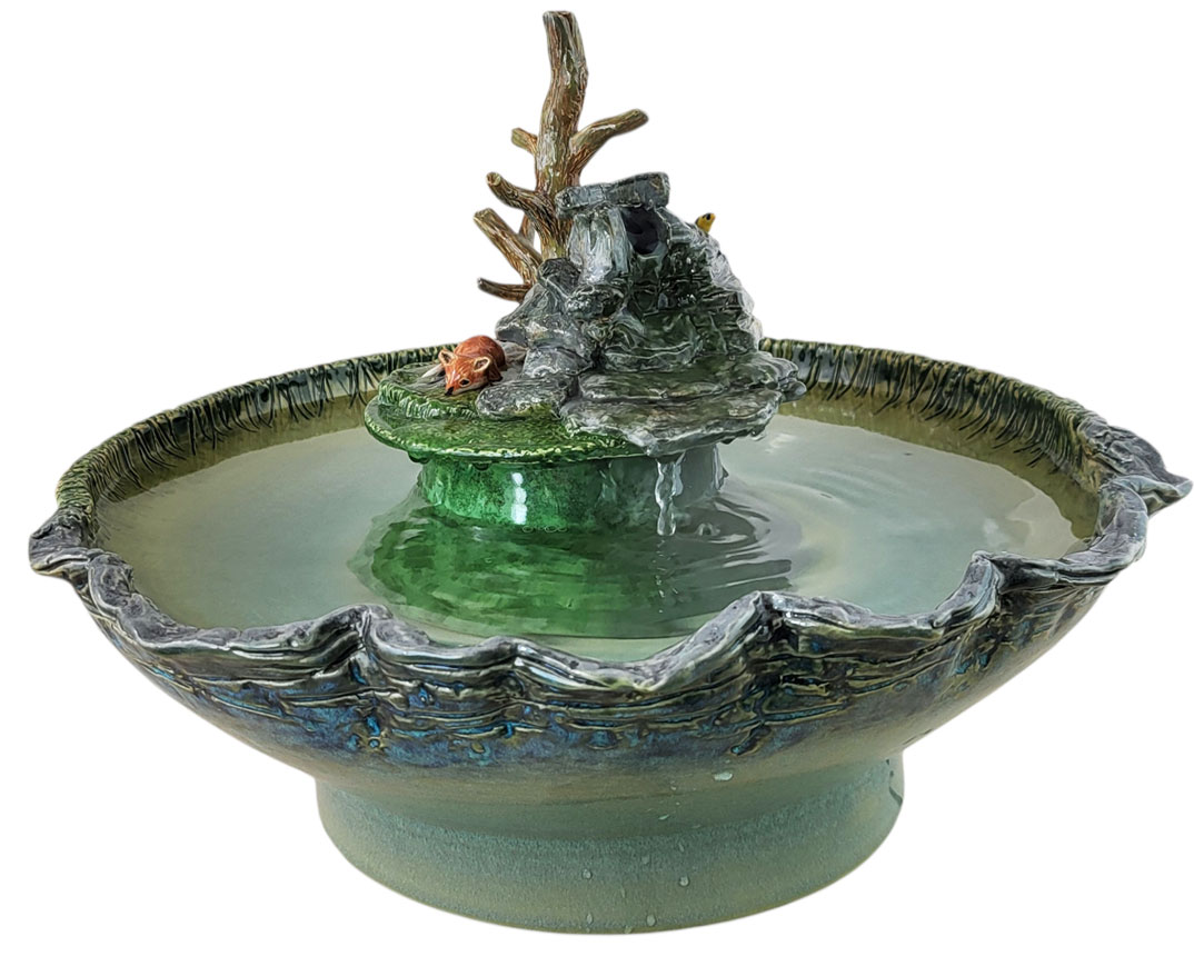 High-fired for strength, depth of color, and lasting durability, the layered glazes evoke the movement of water over mossy rock and forest floor. The gently circulating stream adds a calming, meditative sound, transforming any space into a tranquil woodland retreat.