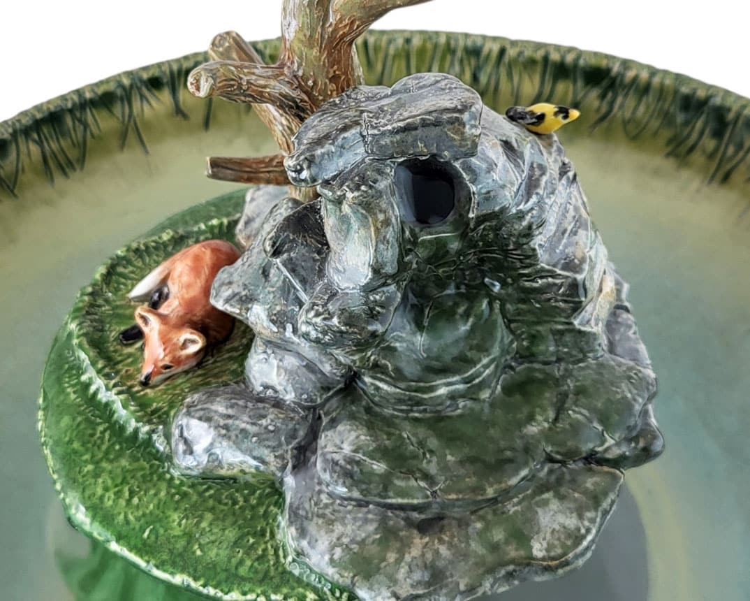 This Woodland Tree, Fox & Bird Sculpture brings a touch of the quiet magic of the forest indoors with this completely hand-sculpted ceramic fountain, featuring a peaceful Red Fox chilling beside a shallow woodland brook beneath an aged tree. An American Goldfinch perches watchfully on textured stone, completing this serene nature vignette. The fountain bowl is textured to reflect the grass and stone of the center piece and every element is individually formed by hand, creating subtle organic variations that make this fountain truly one-of-a-kind.