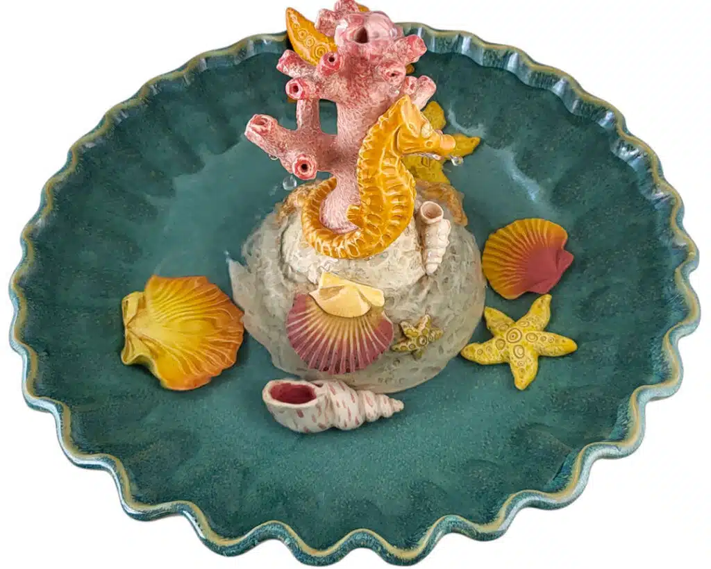 Handcrafted charm: Imperfections in glaze and form—tiny ridges, nuanced color shifts, and delicate details on the seahorse and starfish—signal that this is handcrafted work, not a mass-produced trinket. That authenticity is what makes it special in a home setting.